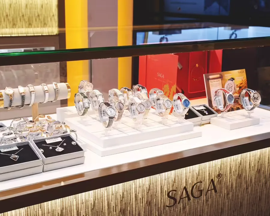 Hải Triều không chỉ bán đồng hồ mà còn cung cấp các dòng trang sức đi kèm, tạo nên một combo hoàn hảo cho người dùng. Nổi bật nhất là sự xuất hiện của thương hiệu Saga – sử dụng pha lê Swarovski chính hãng từ Áo.