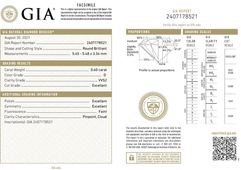 Kim cương sau khi kiểm định sẽ đi kèm với một giấy kiểm định kim cương GIA duy nhất vì mỗi viên kim cương sẽ có chỉ số khác nhau. Hầu như, các viên kim cương được kiểm định bởi GIA sẽ không có viên nào trùng với viên nào.