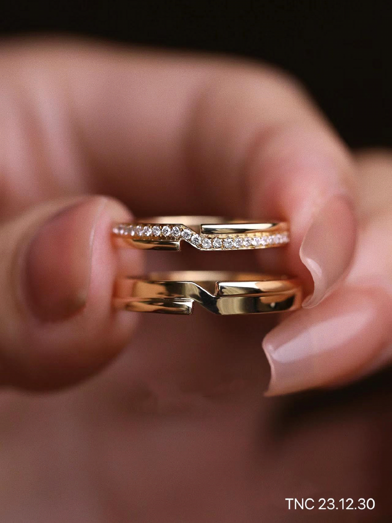 Mẫu nhẫn TNC 23.12.30 được làm từ vàng 14k có phần dày dặn, được thiết kế theo dấu ấn riêng của hai người