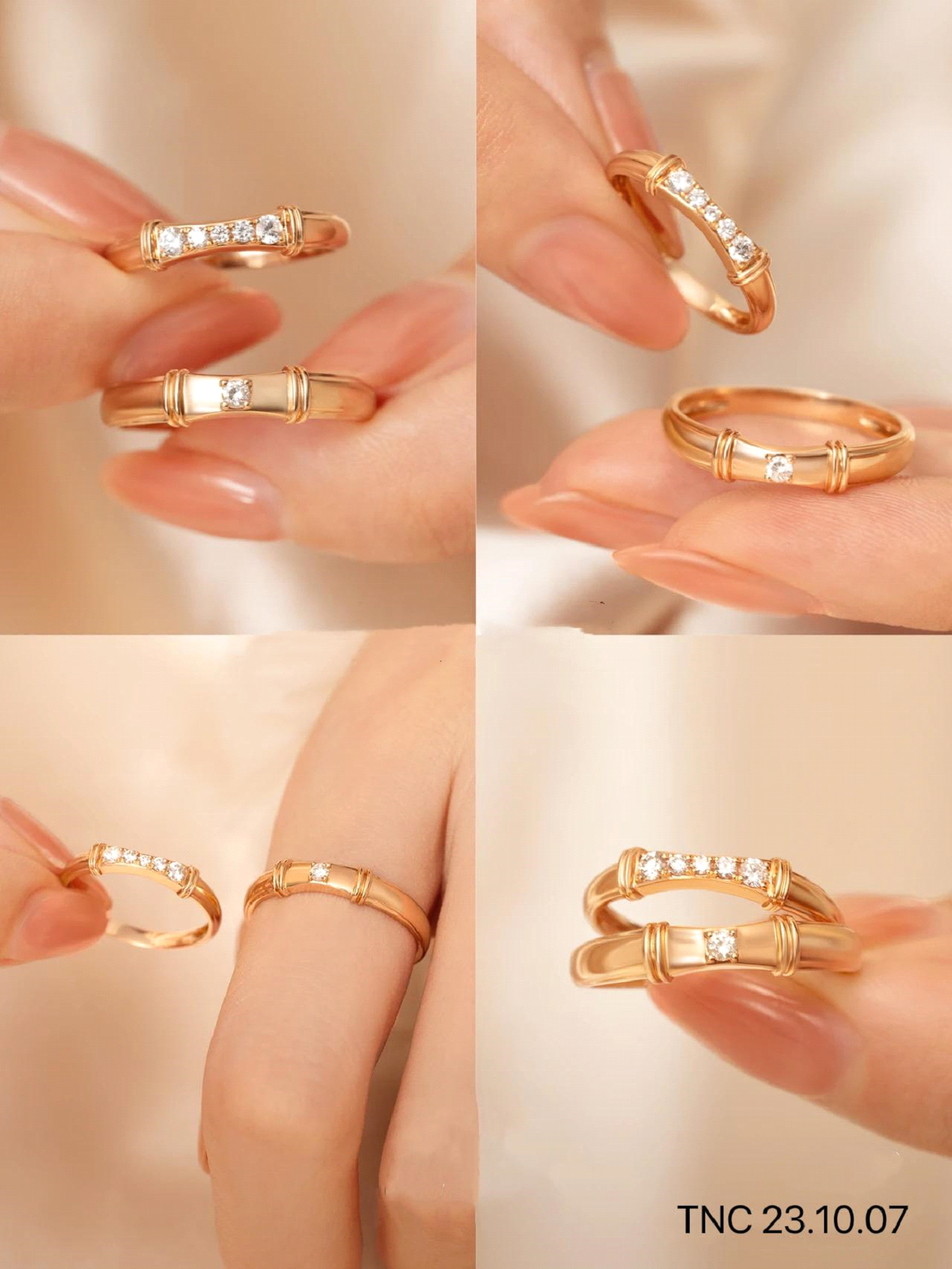 Mẫu nhẫn cưới thiết kế TNC 23.11.18 với chất liệu vàng vàng đính kết những viên đá trắng tạo thành điểm nhấn mềm mại