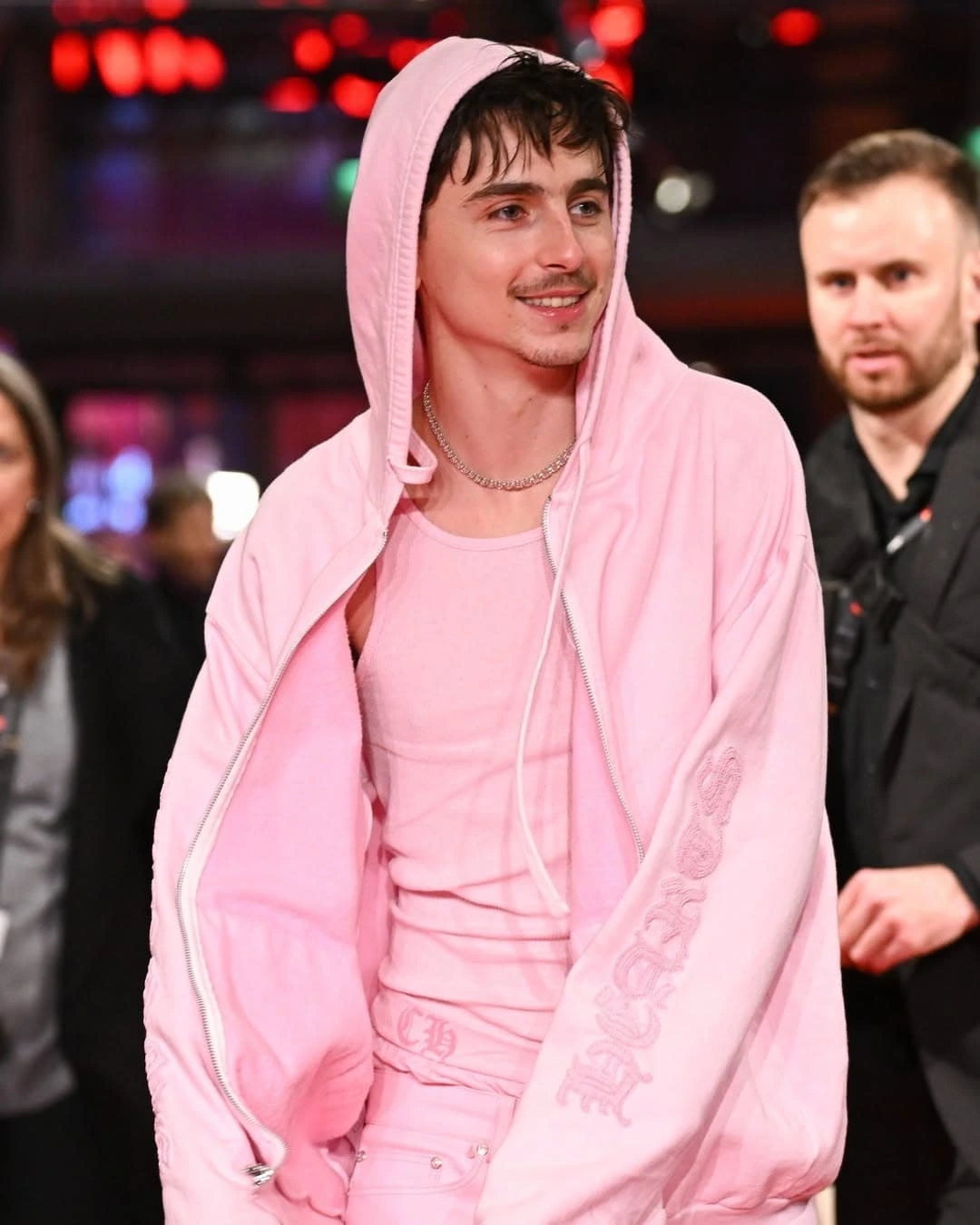 Trong buổi ra mắt A Complete Unknown đúng ngày Lễ Tình Nhân, Timothée Chalamet – người sẽ hóa thân thành Bob Dylan – xuất hiện đầy ấn tượng với set đồ đơn sắc hồng pastel từ Chrome Hearts. Anh diện áo ba lỗ gân, hoodie, quần denim rộng và giày Timberland, hoàn thiện vẻ ngoài phóng khoáng bằng vòng cổ kim cương và đồng hồ tông xuyệt tông. Bất chấp cái lạnh 30 độ F của Berlin, Chalamet vẫn tự tin chinh phục sắc hồng. Trước đó, anh cũng từng gây chú ý tại New York với áo phao hồng, khăn quàng và túi xách Chanel, khẳng định tình yêu đặc biệt dành cho gam màu này.