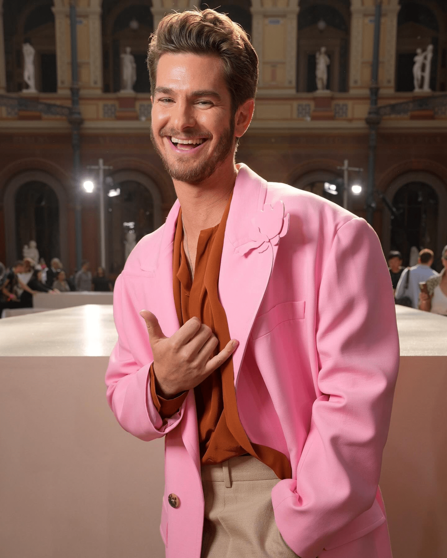 Andrew Garfield cũng không hề kém cạnh khi xuất hiện đầy phong cách tại show diễn Valentino Xuân/Hè 2024. Ngồi hàng ghế đầu tại Tuần lễ Thời trang Paris, anh diện blazer dáng dài hồng nhạt kết hợp áo sơ mi cam cháy và quần tây xám, tạo nên tổng thể hài hòa nhưng vẫn nổi bật. Một lần nữa, Garfield chứng minh rằng sắc hồng có thể mạnh mẽ và thời thượng theo cách rất riêng.