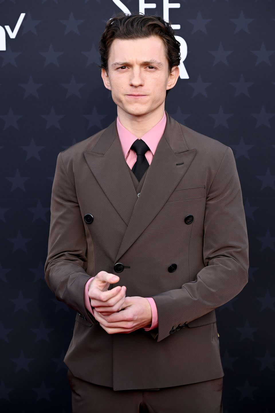 Tại Critics Choice Awards 2024, Tom Holland mang đến hình ảnh lịch lãm với blazer nâu hai hàng khuy, khéo léo phối cùng áo sơ mi hồng bên trong. Công thức phối đồ thông minh này chứng minh rằng màu hồng hoàn toàn có thể trở thành gam màu trung tính, dễ dàng kết hợp với nhiều sắc thái khác. Không chỉ trên thảm đỏ, Holland còn thường xuyên lăng xê sắc hồng trong đời sống thường ngày với áo hoodie, áo thun, thể hiện sự tự tin và phong cách linh hoạt của mình.