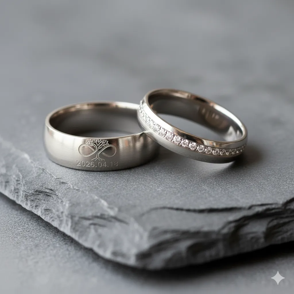 Năm 2026, các cặp đôi không chỉ khắc tên và ngày cưới. Xu hướng dẫn đầu là khắc dấu vân tay của đối phương hoặc biểu đồ sóng âm (soundwave) của lời nói "Anh yêu em". Laser có thể tái hiện chính xác từng đường vân li ti trên nền Platin hay vàng 18K mà không làm thay đổi trọng lượng của vàng, mang lại độ phản chiếu ánh sáng tuyệt vời ngay cả trong lòng nhẫn.