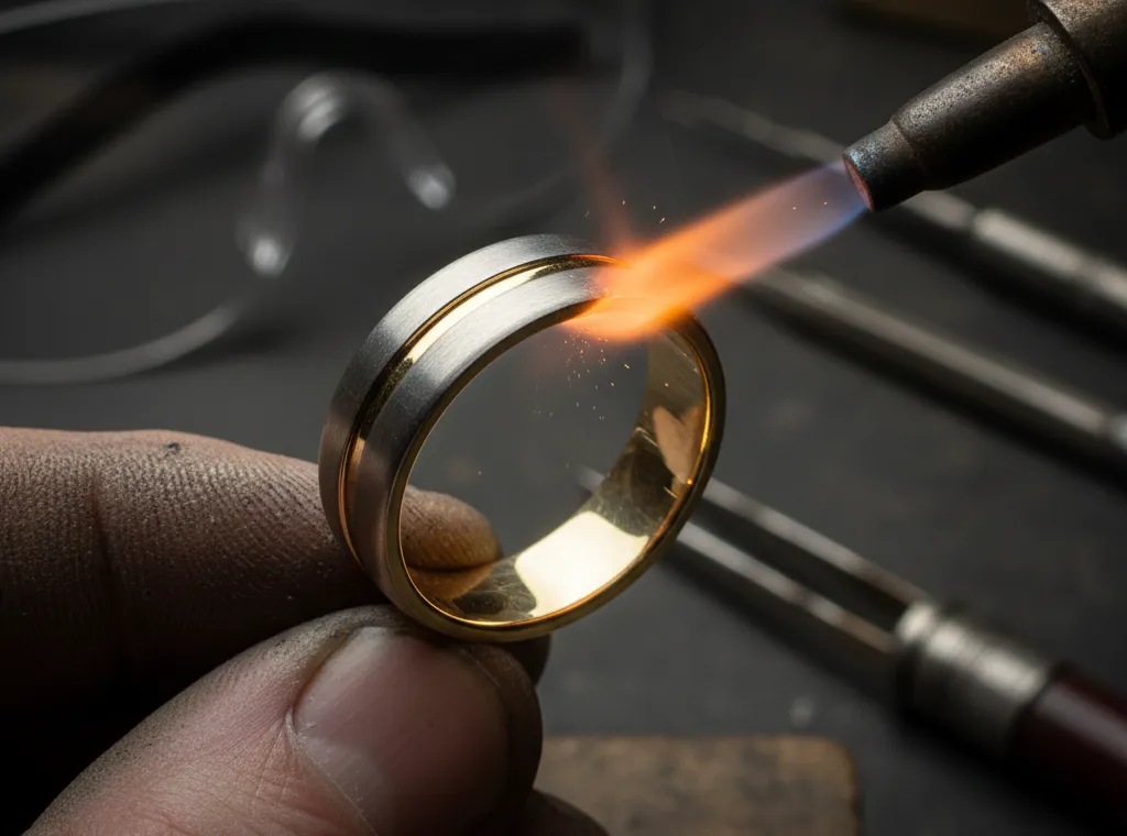- Độ khó cao: Việc cắt và nối lại một chiếc nhẫn phối màu phức tạp hơn nhẫn đơn sắc gấp nhiều lần. Nếu thợ tay nghề yếu, vết hàn sẽ làm lem màu sắc này sang màu sắc kia tại điểm nối.