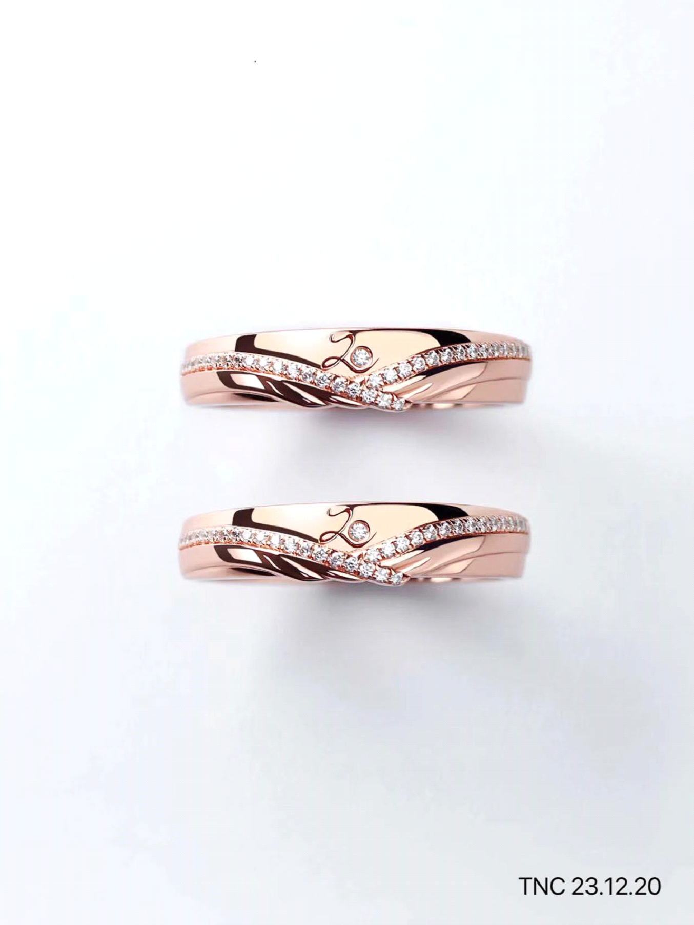 Mẫu nhẫn cưới TNC 23.12.20 trên chất liệu vàng hồng 14k đính kim cương lấp lánh dành cho cặp đôi yêu thích sự cổ điển sang trọng