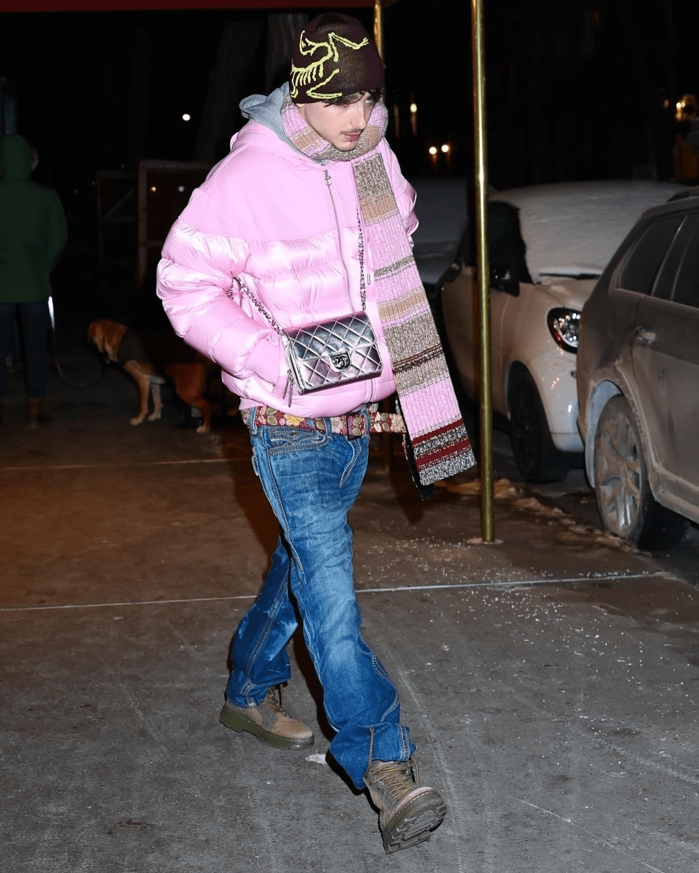 Trong buổi ra mắt A Complete Unknown đúng ngày Lễ Tình Nhân, Timothée Chalamet – người sẽ hóa thân thành Bob Dylan – xuất hiện đầy ấn tượng với set đồ đơn sắc hồng pastel từ Chrome Hearts. Anh diện áo ba lỗ gân, hoodie, quần denim rộng và giày Timberland, hoàn thiện vẻ ngoài phóng khoáng bằng vòng cổ kim cương và đồng hồ tông xuyệt tông. Bất chấp cái lạnh 30 độ F của Berlin, Chalamet vẫn tự tin chinh phục sắc hồng. Trước đó, anh cũng từng gây chú ý tại New York với áo phao hồng, khăn quàng và túi xách Chanel, khẳng định tình yêu đặc biệt dành cho gam màu này.